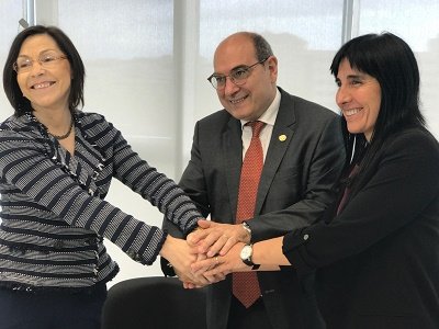 El Consejero de Salud, Jon Darpón, como Presidente del patronato de la Fundación Vasca de Innovación e Investigación Sanitarias; Nekane Balluerka, Rectora de la UPV/EHU; y María Jesús Múgica, Directora General de Osakidetza, han firmado hoy en Vitoria-Gasteiz el convenio de creación del Instituto de Investigación Sanitaria Bioaraba. En el acto han estado presentes además María Aguirre, Directora de Investigación e Innovación Sanitarias del Departamento de Salud, Jesús Larrañaga, Director-Gerente de la OSI Araba y Joaquín Durán, Coordinador de Bioaraba.